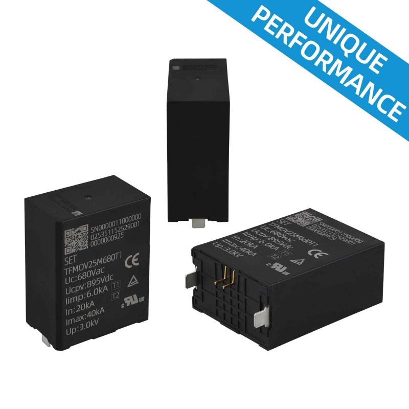Thermal Fuse Varistor (TFV) is a varistor that incorporates thermal protection. This product possesses all the features of a standard MOV while offering additional thermal safeguards. In cases where an MOV becomes degraded due to long-term operation or abnormal surges, the leakage current of the MOV continues to increase, potentially leading to overheating and even fire. The thermal fuse, consisting of a fusible alloy, within the TFV is highly responsive to abnormal temperatures and triggers an action to disconnect the circuit, thereby preventing the MOV from overheating or catching fire. Thermal Fuse Varistors (TFV) finds wide application in various fields such as power supplies, industrial equipment, and communication devices that demand high reliability and weather resistance. SETsafe | SETfuse provides Thermal Fuse Varistors (TFV) with maximum peak current ratings ranging from 5 kA to 10 kA, and maximum continuous voltage ratings from 50 VAC to 510 VAC. These TFVs are equipped with safety certifications such as UL, cUL, TUV, and CQC, and comply with the requirements of RoHS and REACH.。TFMOV is a combination of varistors (MOV) and thermal protection component. Since varistor has the characteristics of aging or degrading; TFMOV can separate the varistor from the main circuitry by opening the thermal protection component when the varistor (MOV) degrades or fails. It is often used in which requires high reliability and weather withstanding, such as photovoltaic inverters, communication equipment, and power supplies in data centers, etc.Thermally Protected Varistors - Mechanically Off Type Thermally Protected Varistors (TFMOV) are thermally protected varistors. TFMOVs have all the characteristics of a thermally protected varistor (MOV), but are also thermally protected. there are two types of deterioration of MOVs: natural deterioration due to long term operation, and deterioration due to an abnormal surge. When a surge occurs, the leakage current of the degraded MOV increases continuously, causing the surface temperature of the MOV to rise continuously and the possibility of fire. At this time, the heat of the MOV in TFMOV is conducted to the cryogenic alloy solder joint, which senses the abnormal temperature and acts (fuses), driving the spring slider to cut off the circuit, disconnecting the MOV from the main circuit and thus protecting the entire circuit, as well as the MOV itself will not continue to heat up, and the phenomenon of catching fire. Thermal protection type varistor-mechanical release type (TFMOV) is widely used in over-voltage protection of new energy equipments and communication equipments. They play a great role in the absorption of abnormal voltage and lightning surge. SETsafe | SETfuse companies Thermally Protected Varistors (TFMOV) are mainly composed of varistors (MOV), mechanical disconnectors, flame retardant cases and metal components. Nominal Discharge Current: (5 ~ 20) kA; Maximum Continuous Operating Voltage: (17 ~ 750) VAC; Maximum Continuous Operating DC Voltage: (500 ~ 1000) VDC; Safety Approvals: UL, cUL, TUV, CE; Complies with RoHS, REACH requirements.