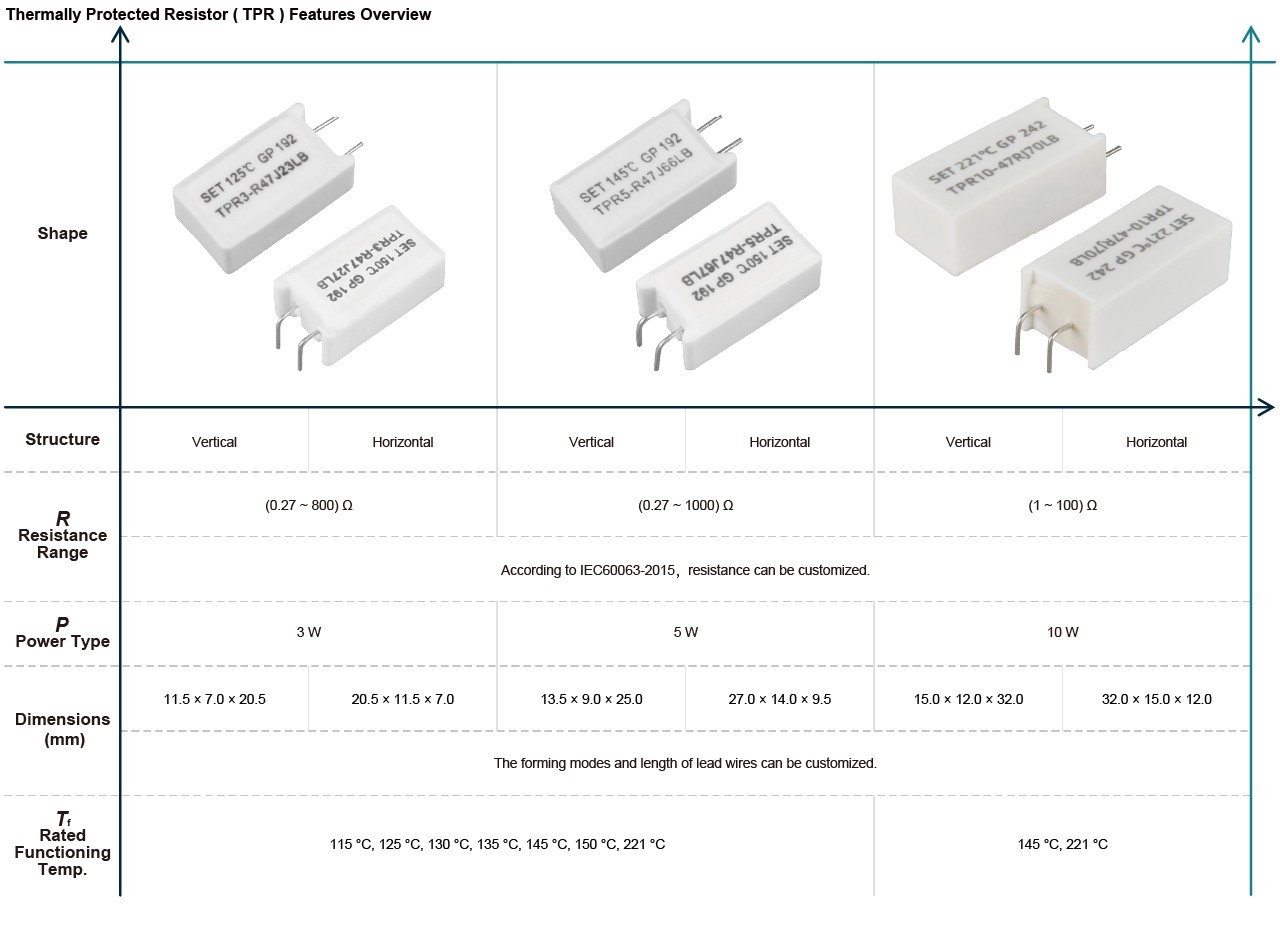 SETsafe | SETfuseThermally Protected Resistor (TPR) is an unique type of Power Resistor, with Over Temp. and Over Current Protections. Thermally Protected Resistor (TPR) is a type of power resistor, where Alloy Thermal-Link (ATCO) and Fusible Wirewound Resistor (RXF) in a ceramic case with silicone cement. It is not only able to proceed over temp. protection by ATCO itself but also proceed over current protection by RXF transferring heat to ATCO to open the circuit.