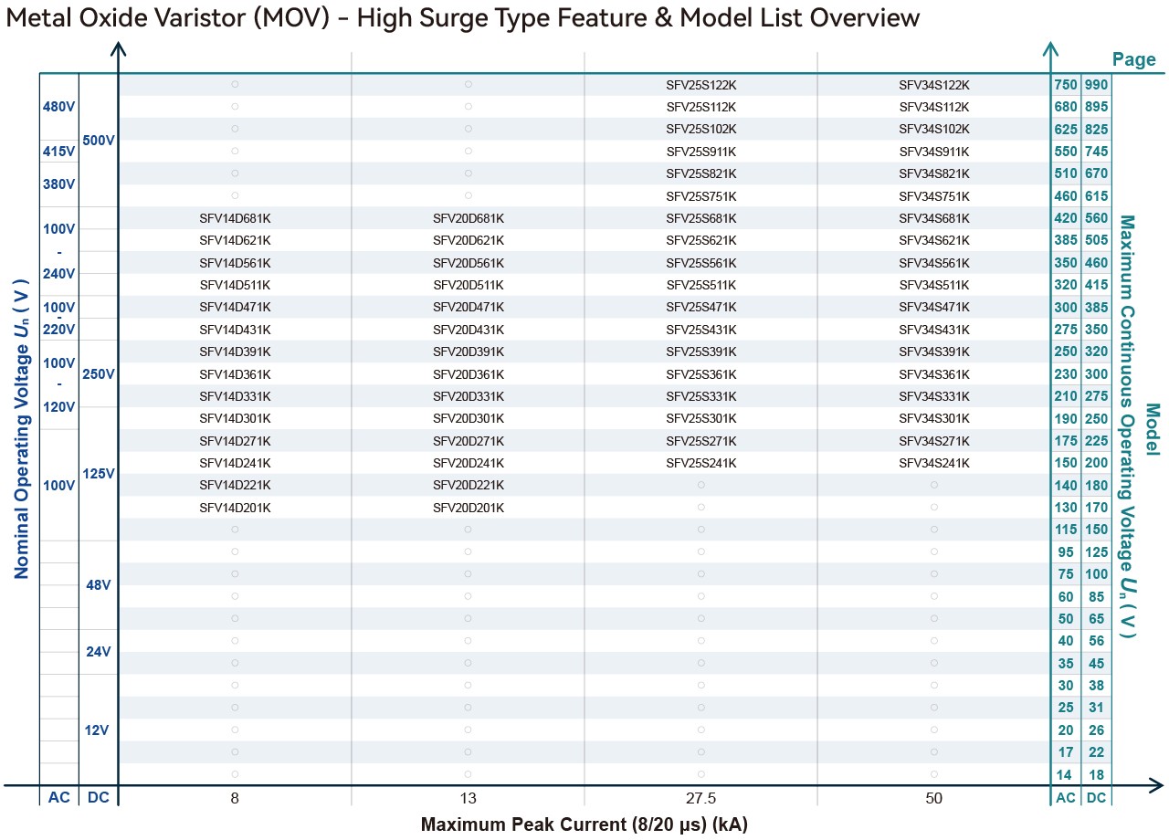 Metal Oxide Varistor (MOV) is a nonlinear resistance component with zinc oxide (ZnO) as its main constituent. The resistance of an MOV is sensitive to changes in the applied voltage. Below the threshold voltage, the MOV exhibits high resistance, allowing only a negligibly small leakage current to flow. Once the threshold voltage is exceeded, the resistance of the MOV drops sharply, enabling the conduction of a large current. This characteristic makes the MOV suitable for detecting and suppressing surge voltage and overvoltage, thereby protecting the circuit from damage caused by excessive voltage. The Metal Oxide Varistor (MOV) finds wide application in various fields such as photovoltaics, communication, lightning protection, power supply, and power strips. It serves to suppress transient overvoltage and absorb surge energy within the circuit. SETsafe | SETfuse offers Metal Oxide Varistors (MOV) with maximum peak current ratings ranging from 0.75 kA to 70 kA, and maximum continuous voltage ratings from 14 VAC to 750 VAC. These MOVs are equipped with safety certifications such as UL, cUL, TUV, and CQC, and comply with RoHS and REACH requirements. Compared with standard type varistor, the highsurge impact varistor uses materials withextra high performance, having impulse capacity about 30% higher than normal varistorof the same size. Besides, the varistor has good long-term stability, and can be used in higher surge requirement or miniaturization designmen.