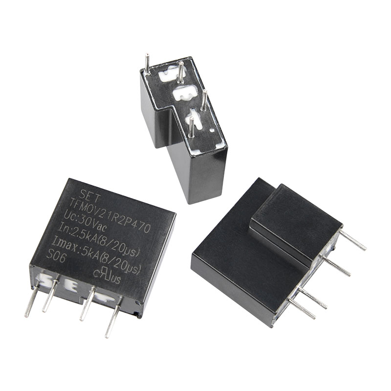 Thermally Protected Varistors - Mechanically Off Type Thermally Protected Varistors (TFMOV) are thermally protected varistors. TFMOVs have all the characteristics of a thermally protected varistor (MOV), but are also thermally protected. there are two types of deterioration of MOVs: natural deterioration due to long term operation, and deterioration due to an abnormal surge. When a surge occurs, the leakage current of the degraded MOV increases continuously, causing the surface temperature of the MOV to rise continuously and the possibility of fire. At this time, the heat of the MOV in TFMOV is conducted to the cryogenic alloy solder joint, which senses the abnormal temperature and acts (fuses), driving the spring slider to cut off the circuit, disconnecting the MOV from the main circuit and thus protecting the entire circuit, as well as the MOV itself will not continue to heat up, and the phenomenon of catching fire. Thermal protection type varistor-mechanical release type (TFMOV) is widely used in over-voltage protection of new energy equipments and communication equipments. They play a great role in the absorption of abnormal voltage and lightning surge. SETsafe | SETfuse companies Thermally Protected Varistors (TFMOV) are mainly composed of varistors (MOV), mechanical disconnectors, flame retardant cases and metal components. Nominal Discharge Current: (5 ~ 20) kA; Maximum Continuous Operating Voltage: (17 ~ 750) VAC; Maximum Continuous Operating DC Voltage: (500 ~ 1000) VDC; Safety Approvals: UL, cUL, TUV, CE; Complies with RoHS, REACH requirements.