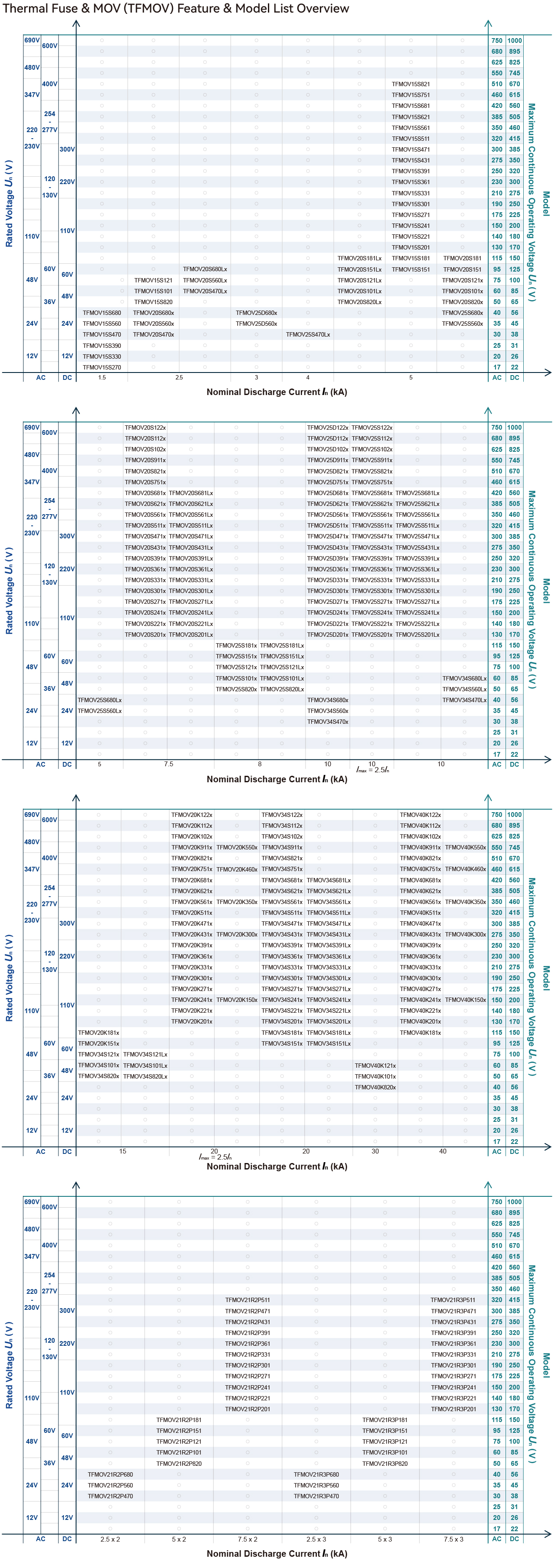 TFMOV is a combination of varistors (MOV) and thermal protection component. Since varistor has the characteristics of aging or degrading; TFMOV can separate the varistor from the main circuitry by opening the thermal protection component when the varistor (MOV) degrades or fails. It is often used in which requires high reliability and weather withstanding, such as photovoltaic inverters, communication equipment, and power supplies in data centers, etc.