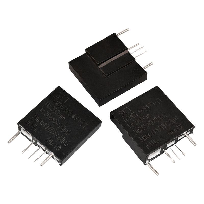Thermally Protected Varistors - Mechanically Off Type Thermally Protected Varistors (TFMOV) are thermally protected varistors. TFMOVs have all the characteristics of a thermally protected varistor (MOV), but are also thermally protected. there are two types of deterioration of MOVs: natural deterioration due to long term operation, and deterioration due to an abnormal surge. When a surge occurs, the leakage current of the degraded MOV increases continuously, causing the surface temperature of the MOV to rise continuously and the possibility of fire. At this time, the heat of the MOV in TFMOV is conducted to the cryogenic alloy solder joint, which senses the abnormal temperature and acts (fuses), driving the spring slider to cut off the circuit, disconnecting the MOV from the main circuit and thus protecting the entire circuit, as well as the MOV itself will not continue to heat up, and the phenomenon of catching fire. Thermal protection type varistor-mechanical release type (TFMOV) is widely used in over-voltage protection of new energy equipments and communication equipments. They play a great role in the absorption of abnormal voltage and lightning surge. SETsafe | SETfuse companies Thermally Protected Varistors (TFMOV) are mainly composed of varistors (MOV), mechanical disconnectors, flame retardant cases and metal components. Nominal Discharge Current: (5 ~ 20) kA; Maximum Continuous Operating Voltage: (17 ~ 750) VAC; Maximum Continuous Operating DC Voltage: (500 ~ 1000) VDC; Safety Approvals: UL, cUL, TUV, CE; Complies with RoHS, REACH requirements.